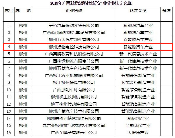 2020年5月,廣西壯族自治區(qū)新興產(chǎn)業(yè)發(fā)展辦公室發(fā)布了《關(guān)于公布2019年廣西新增戰(zhàn)略性新興產(chǎn)業(yè)企業(yè)認(rèn)定名單的通知》,認(rèn)定全區(qū)103家企業(yè)為2019年廣西新增戰(zhàn)略性新興產(chǎn)業(yè)企業(yè),作為電機(jī)控制器及其核心零部件產(chǎn)品研發(fā)、生產(chǎn)和銷售為一體的新能源動(dòng)力總成核心零部件供應(yīng)商,柳州臻驅(qū)成功入圍該批戰(zhàn)略性新興企業(yè)認(rèn)定。