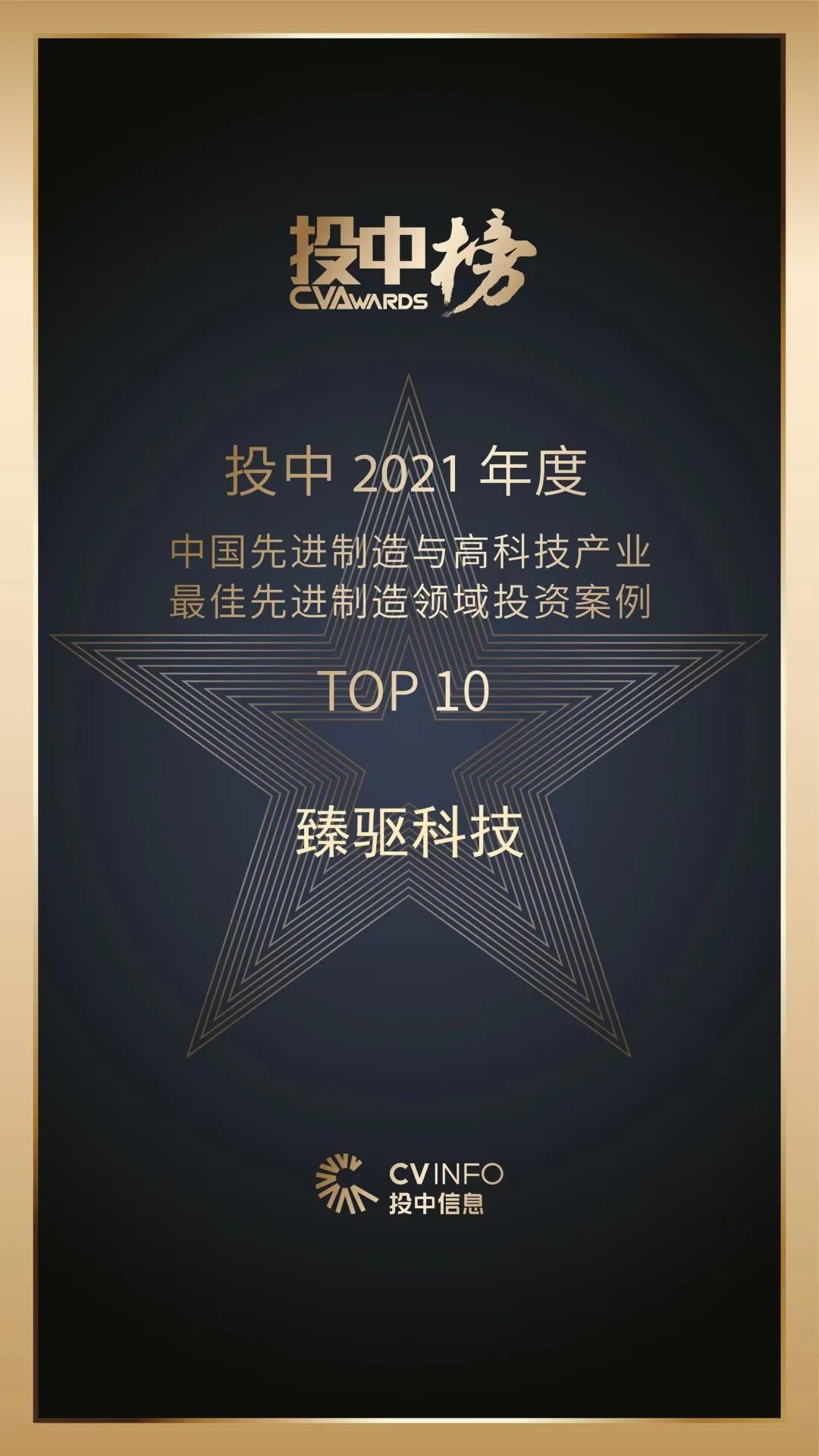 5月30日, 2021年度投中榜正式發布。臻驅科技榮登2021年度中國先進制造與高科技產業最佳先進制造領域投資案例TOP10。